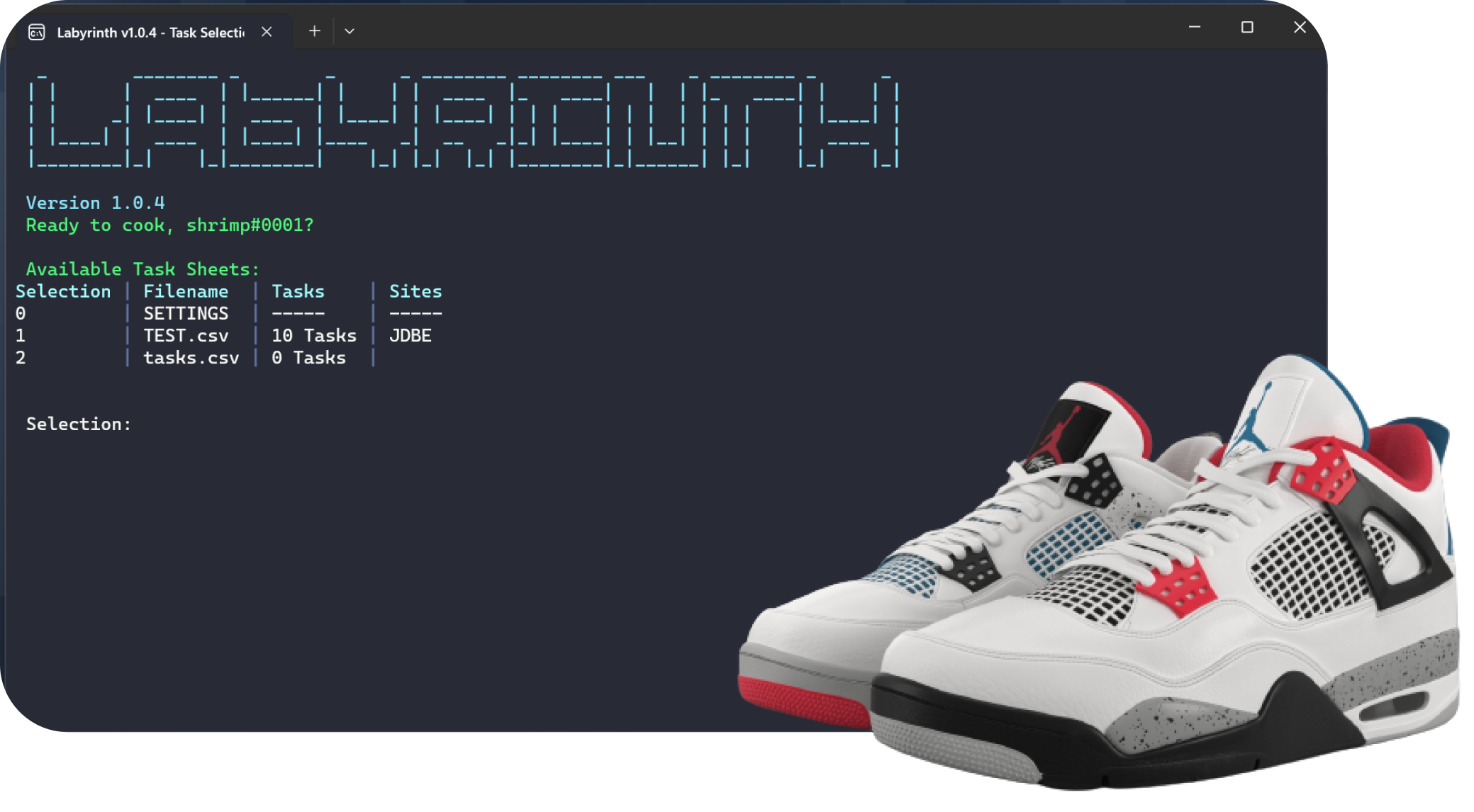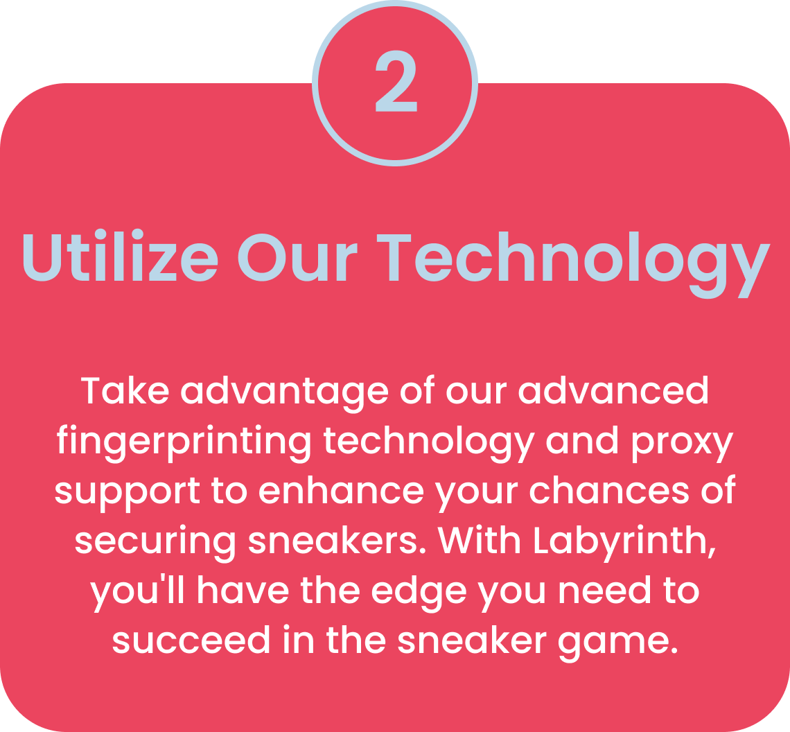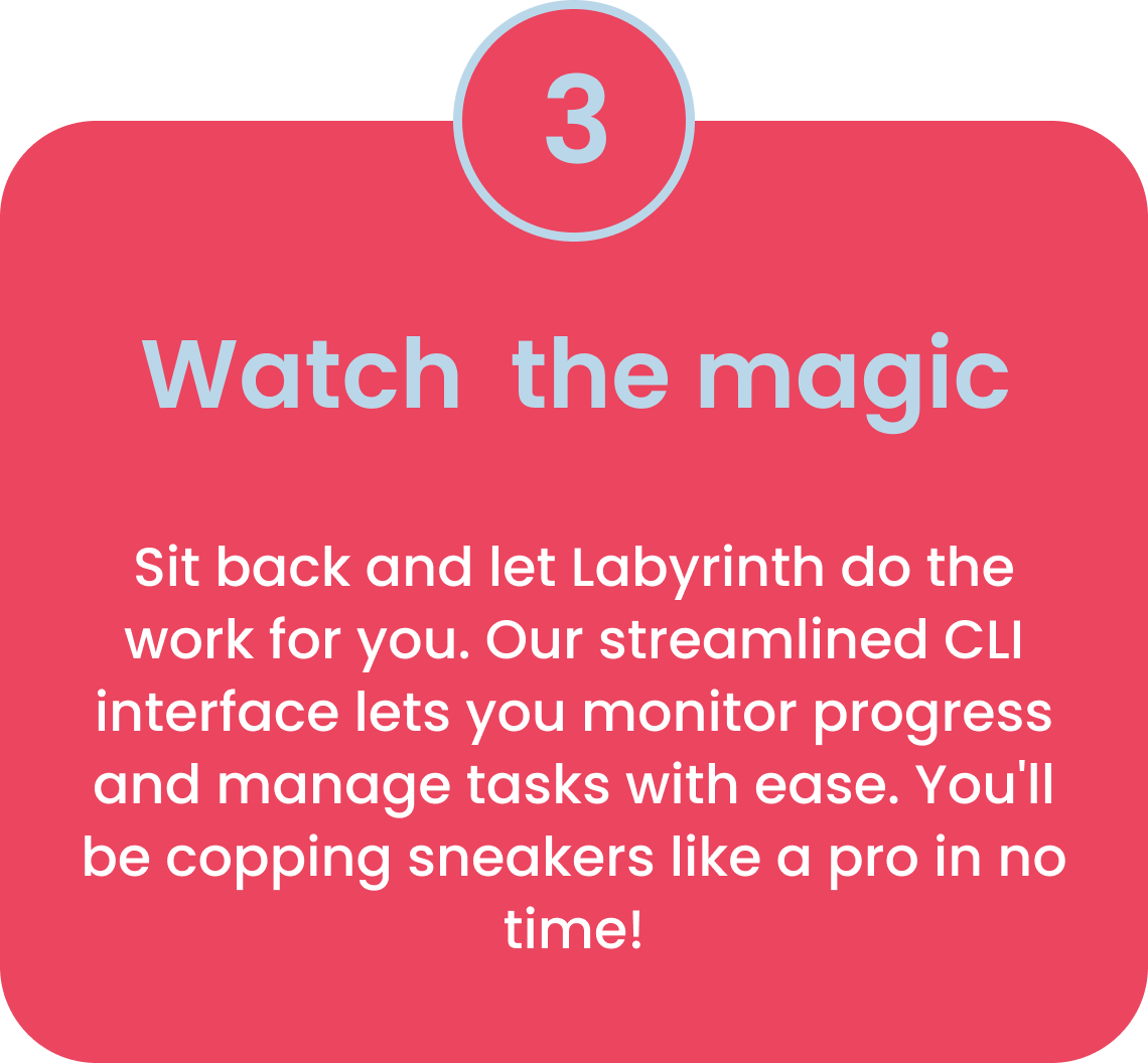 At Labyrinth, we're all about helping sneakerheads secure their dream kicks. With our advanced sneaker bot and years upon years of experience in the batting scene, you'll never have to worry about taking an L again. Our bot is equipped with Safe & Turbo Mode covering every drop situation, advanced unique task fingerprinting technology, and proxy support to give you the ultimate edge in the sneaker game. Plus, with our easy-to-use CLI interface and CSV sheets as well as Quicktask Support, you'll be able to manage your tasks and get going with ease. Trust us, Labyrinth will have you copping sneakers like a pro in no time!